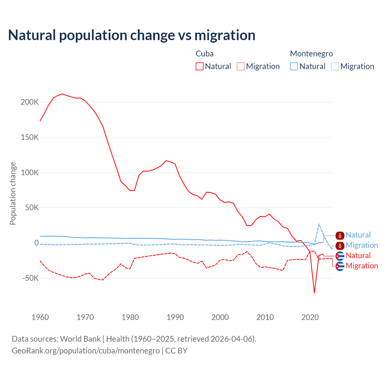 Over the last 10 years, 21.9% of the population change in Cuba is from natural causes (a loss of 64,179 people) and 78.1% is from migration (a loss of 229,508 people). In Montenegro 52.4% is from natural causes (a gain of 4,501 people) and 47.6% is from migration (a gain of 4,095 people).