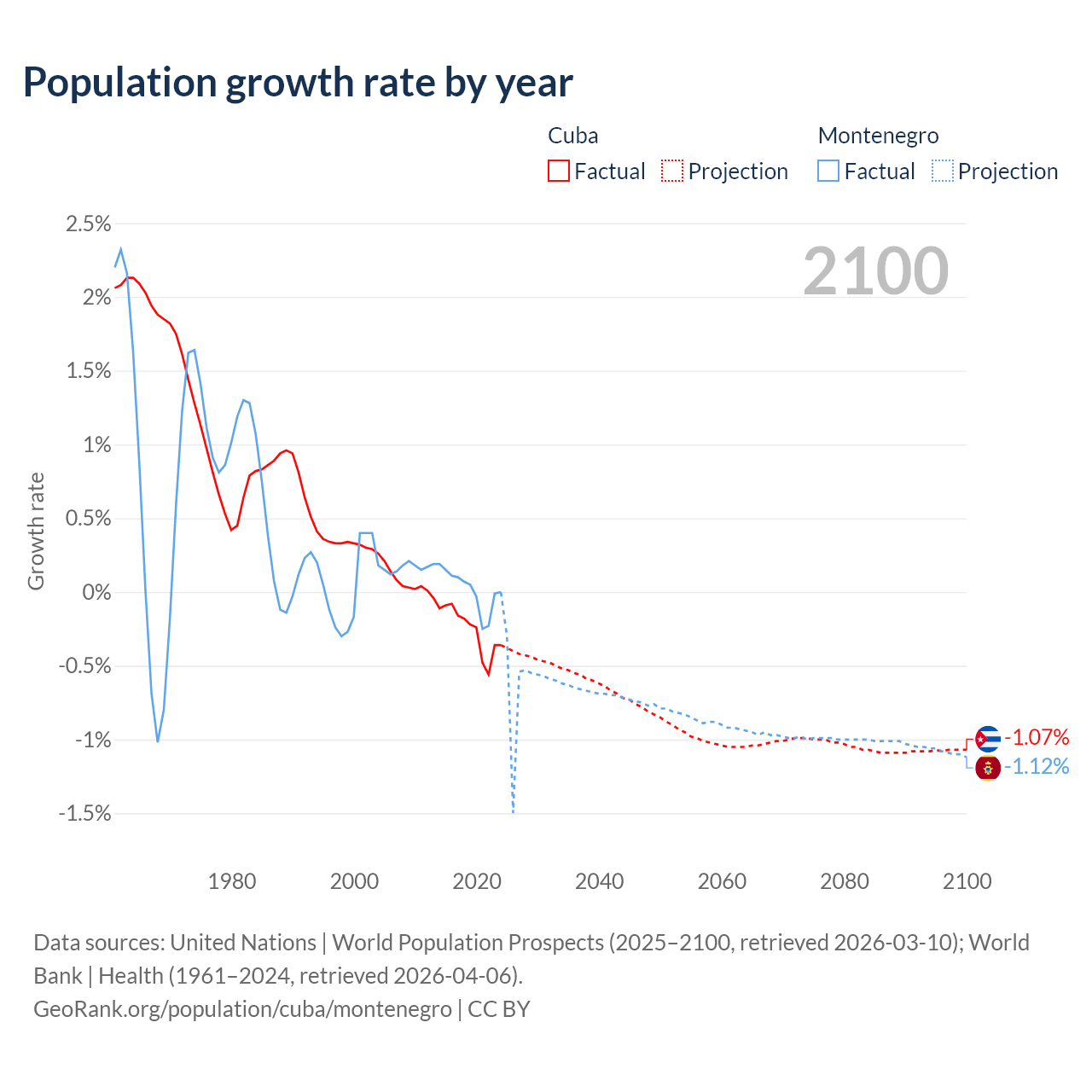 - For the last 10 years, Cuba has had an average growth rate of -0.26% per year vs +0.01% in Montenegro.