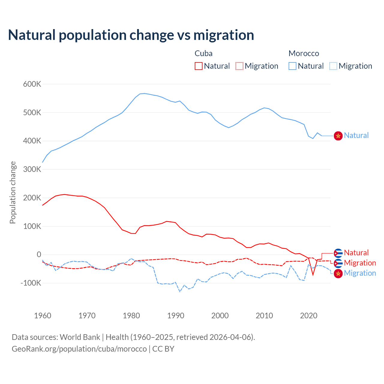 Over the last 10 years, 21.9% of the population change in Cuba is from natural causes (a loss of 64,179 people) and 78.1% is from migration (a loss of 229,508 people). In Morocco 88.3% is from natural causes (a gain of 4,495,223 people) and 11.7% is from migration (a loss of 594,083 people).