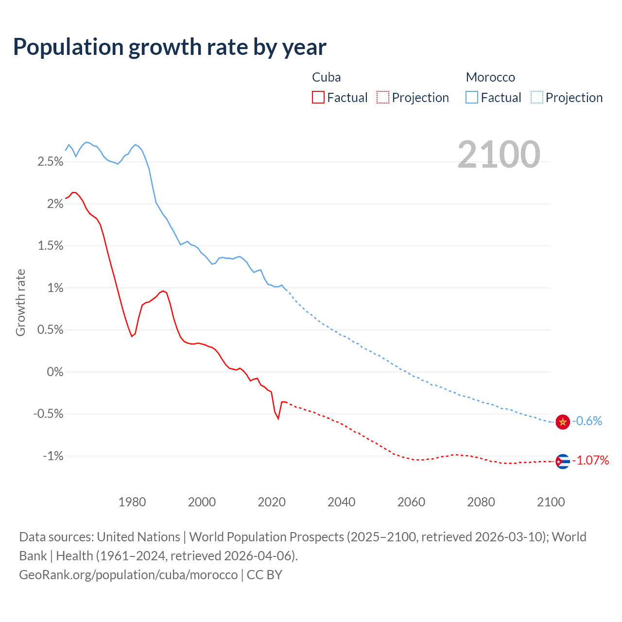 - For the last 10 years, Cuba has had an average growth rate of -0.26% per year vs +1.09% in Morocco.