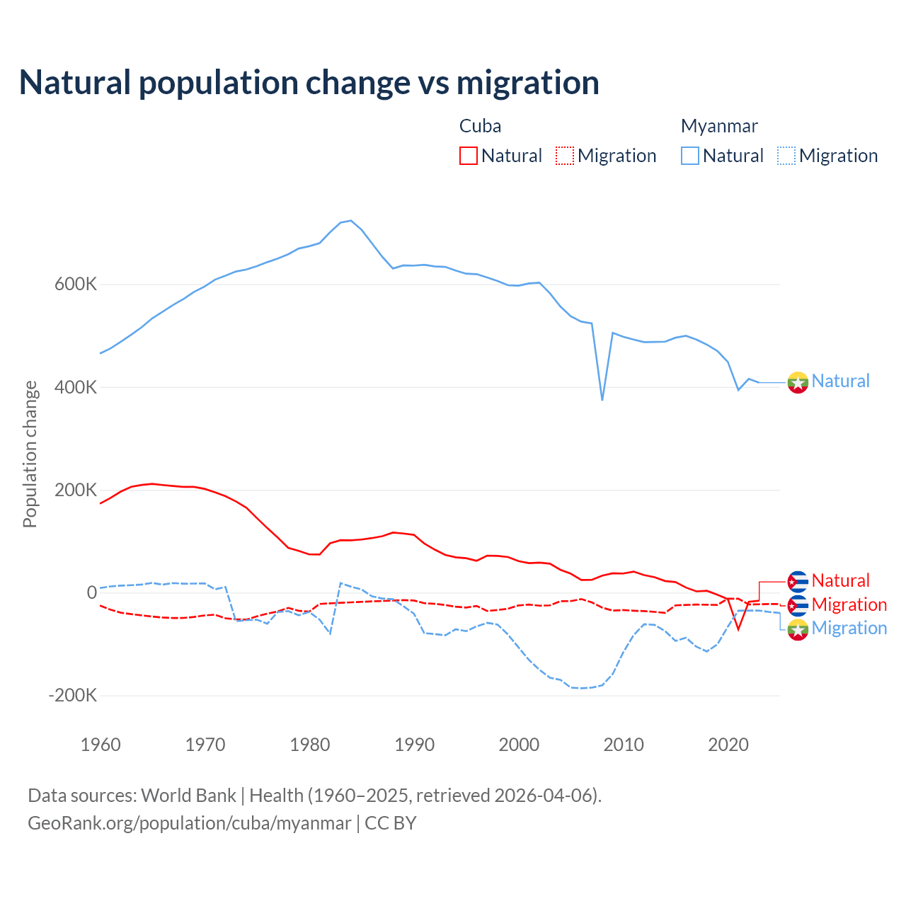 Over the last 10 years, 21.9% of the population change in Cuba is from natural causes (a loss of 64,179 people) and 78.1% is from migration (a loss of 229,508 people). In Myanmar 86% is from natural causes (a gain of 4,594,615 people) and 14% is from migration (a loss of 749,272 people).