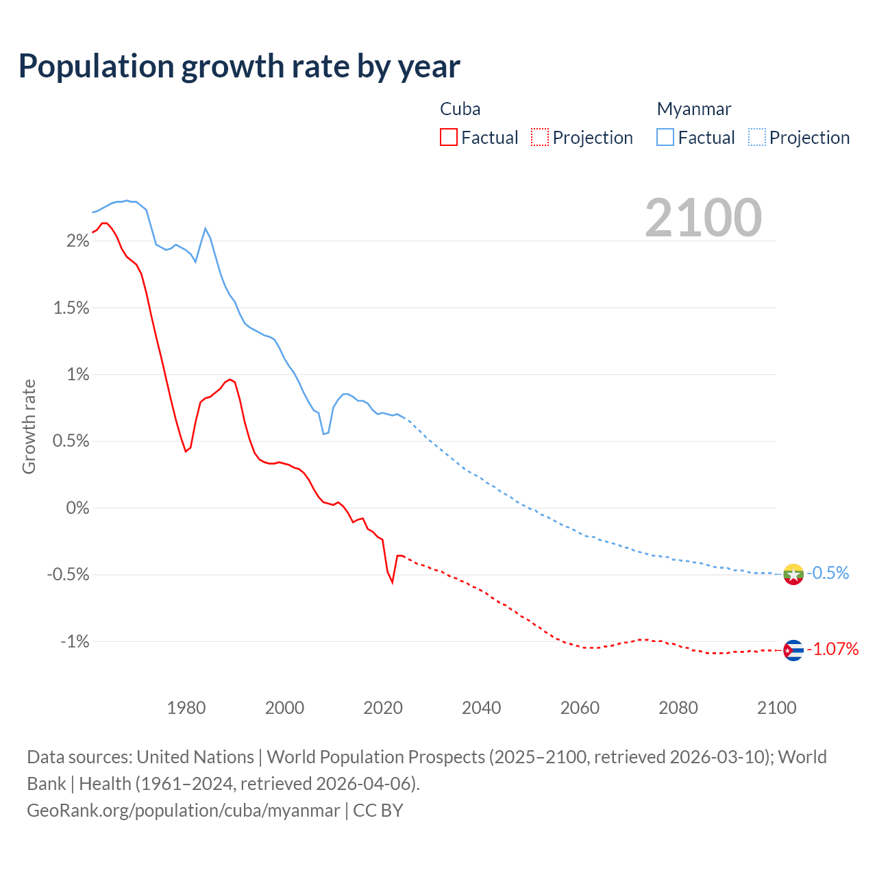 - For the last 10 years, Cuba has had an average growth rate of -0.26% per year vs +0.74% in Myanmar.