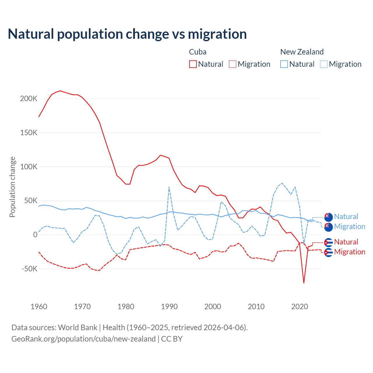 Over the last 10 years, 21.9% of the population change in Cuba is from natural causes (a loss of 64,179 people) and 78.1% is from migration (a loss of 229,508 people). In New Zealand 34.4% is from natural causes (a gain of 247,767 people) and 65.6% is from migration (a gain of 471,602 people).