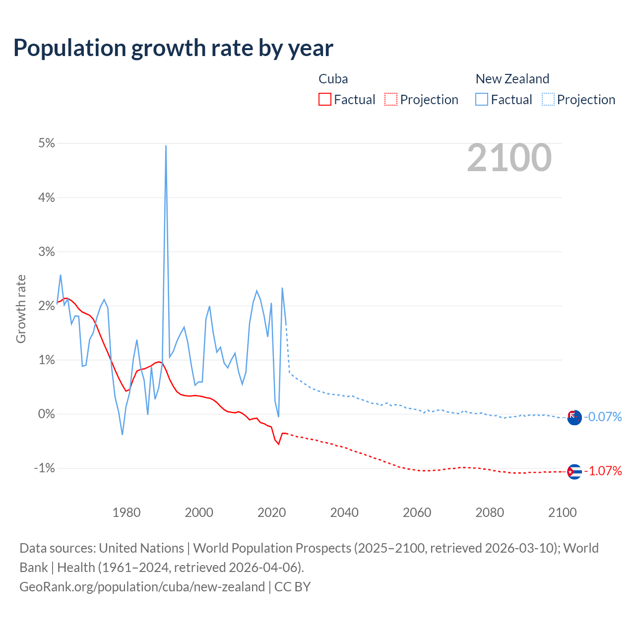 - For the last 10 years, Cuba has had an average growth rate of -0.26% per year vs +1.6% in New Zealand.