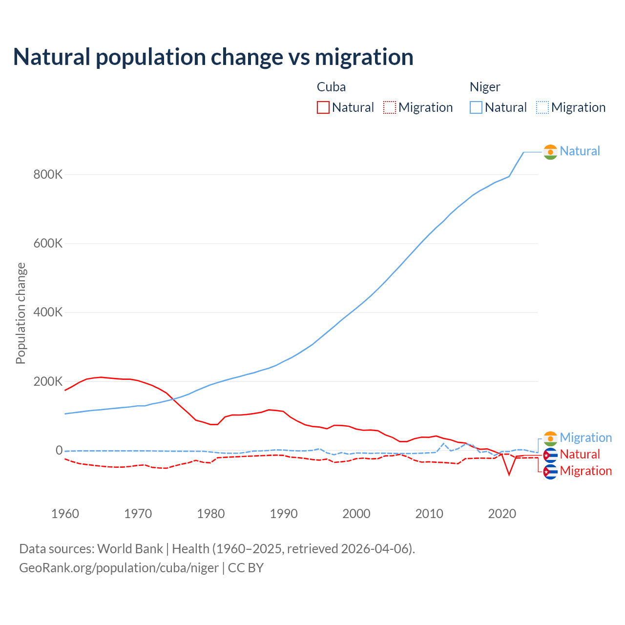 Over the last 10 years, 21.9% of the population change in Cuba is from natural causes (a loss of 64,179 people) and 78.1% is from migration (a loss of 229,508 people). In Niger 100% is from natural causes (a gain of 7,728,287 people) and 0.03% is from migration (a gain of 2,520 people).