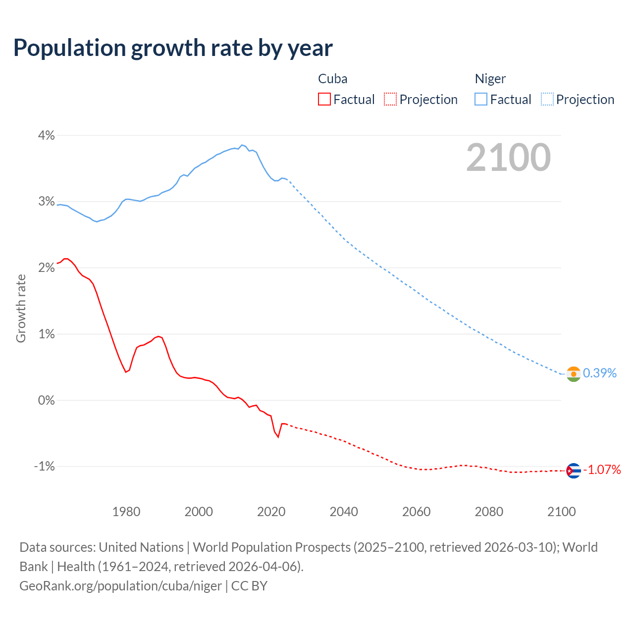 - For the last 10 years, Cuba has had an average growth rate of -0.26% per year vs +3.5% in Niger.