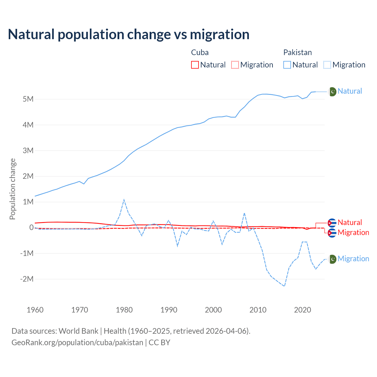 Over the last 10 years, 21.9% of the population change in Cuba is from natural causes (a loss of 64,179 people) and 78.1% is from migration (a loss of 229,508 people). In Pakistan 77.8% is from natural causes (a gain of 51,255,404 people) and 22.2% is from migration (a loss of 14,629,055 people).