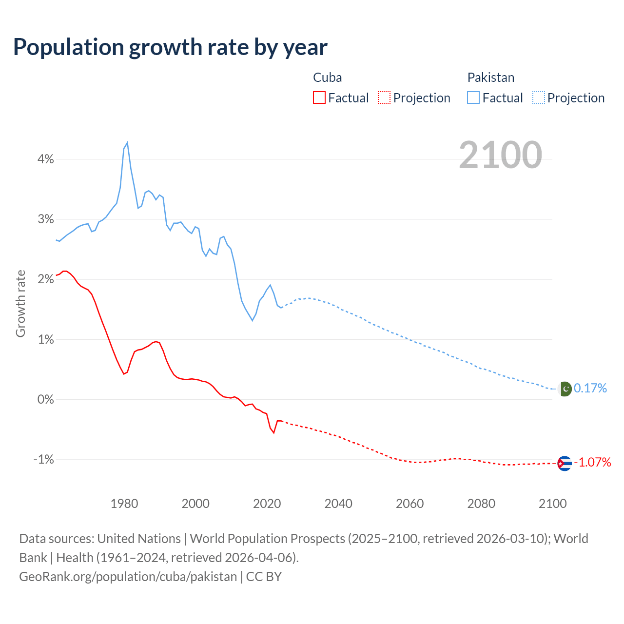 Data sources: World Bank | Health (1960–2024, retrieved 2026-04-06); United Nations | World Population Prospects (1960–2026, retrieved 2026-03-10); U.S. Census Bureau (1960–2025, retrieved 2026-02-08); Central Intelligence Agency (CIA) (2000–2019, retrieved 2026-02-20).