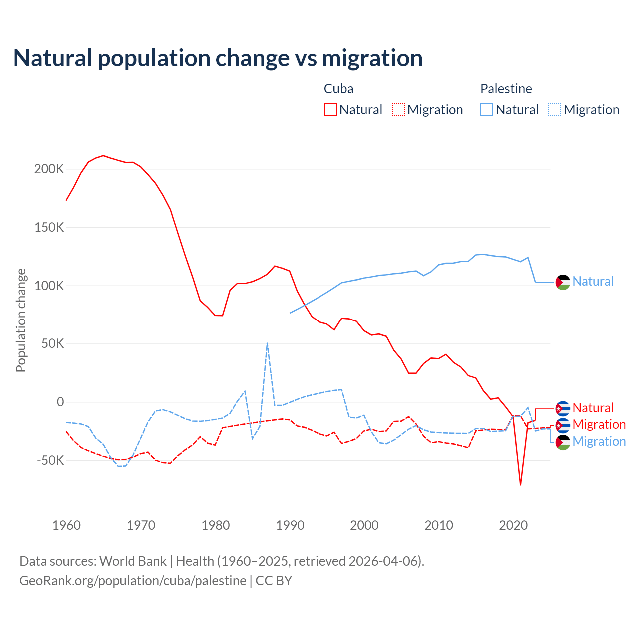 Over the last 10 years, 21.9% of the population change in Cuba is from natural causes (a loss of 64,179 people) and 78.1% is from migration (a loss of 229,508 people). In Palestine 85.7% is from natural causes (a gain of 1,218,010 people) and 14.3% is from migration (a loss of 202,820 people).