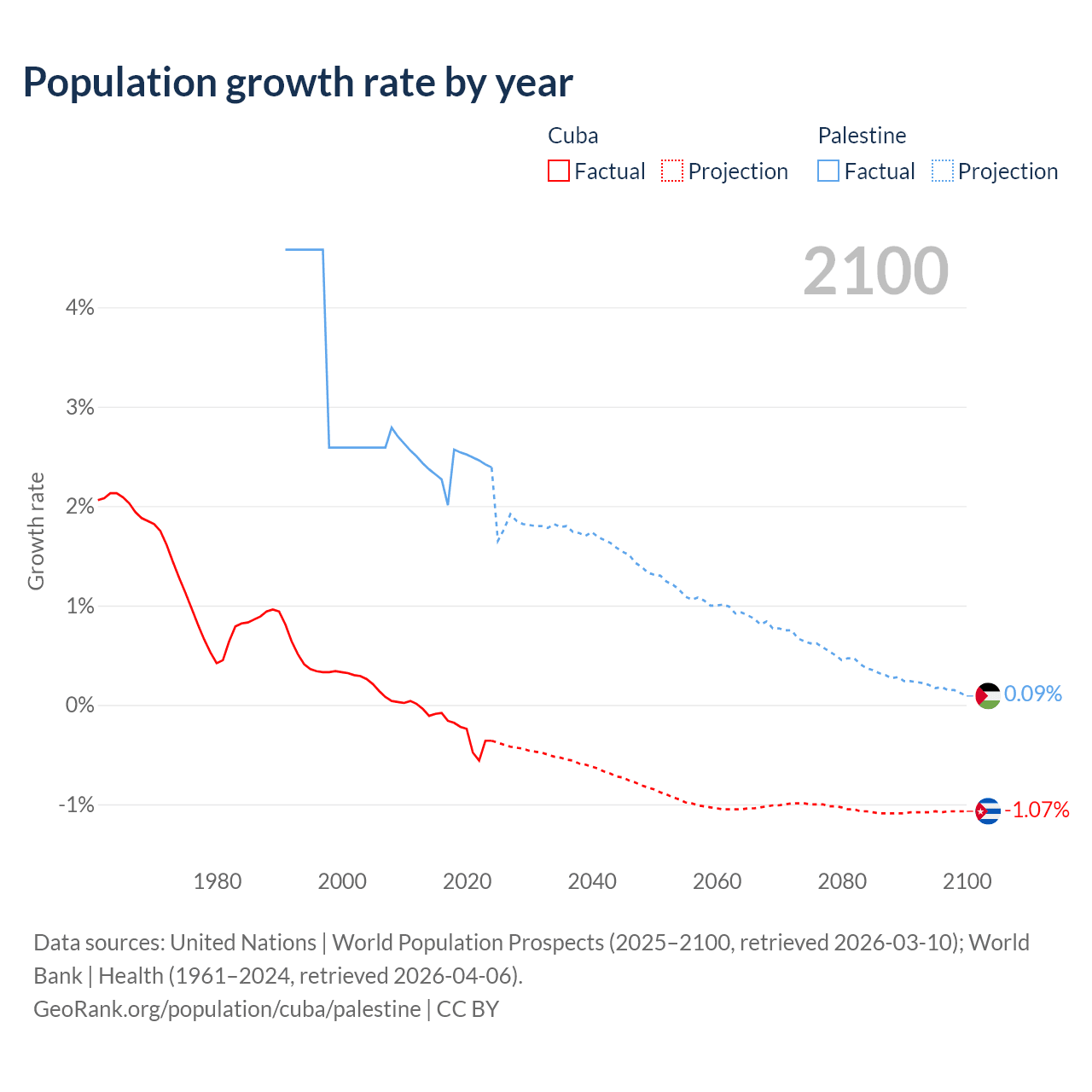 - For the last 10 years, Cuba has had an average growth rate of -0.26% per year vs +2.4% in Palestine.