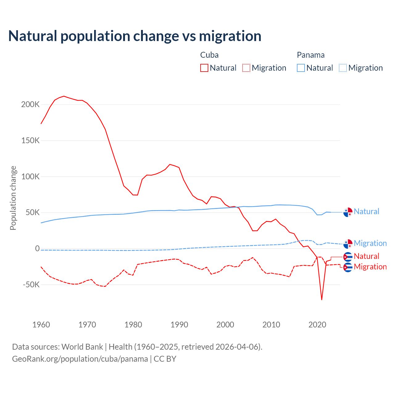 Over the last 10 years, 21.9% of the population change in Cuba is from natural causes (a loss of 64,179 people) and 78.1% is from migration (a loss of 229,508 people). In Panama 86.5% is from natural causes (a gain of 544,211 people) and 13.5% is from migration (a gain of 84,849 people).
