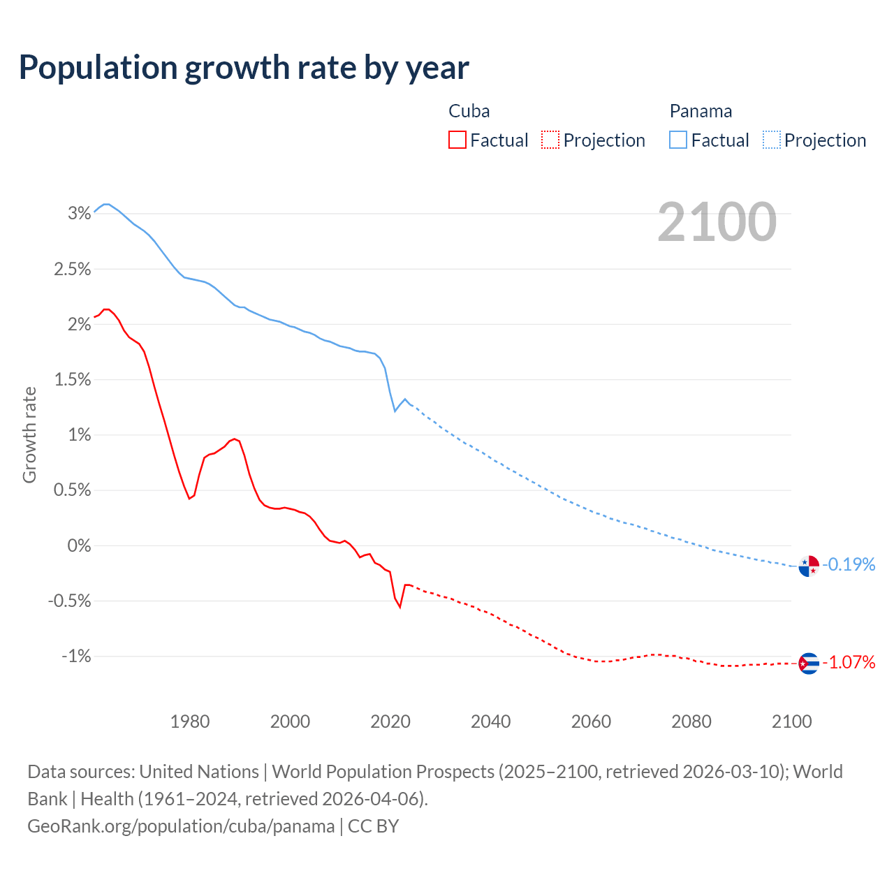 - For the last 10 years, Cuba has had an average growth rate of -0.26% per year vs +1.52% in Panama.