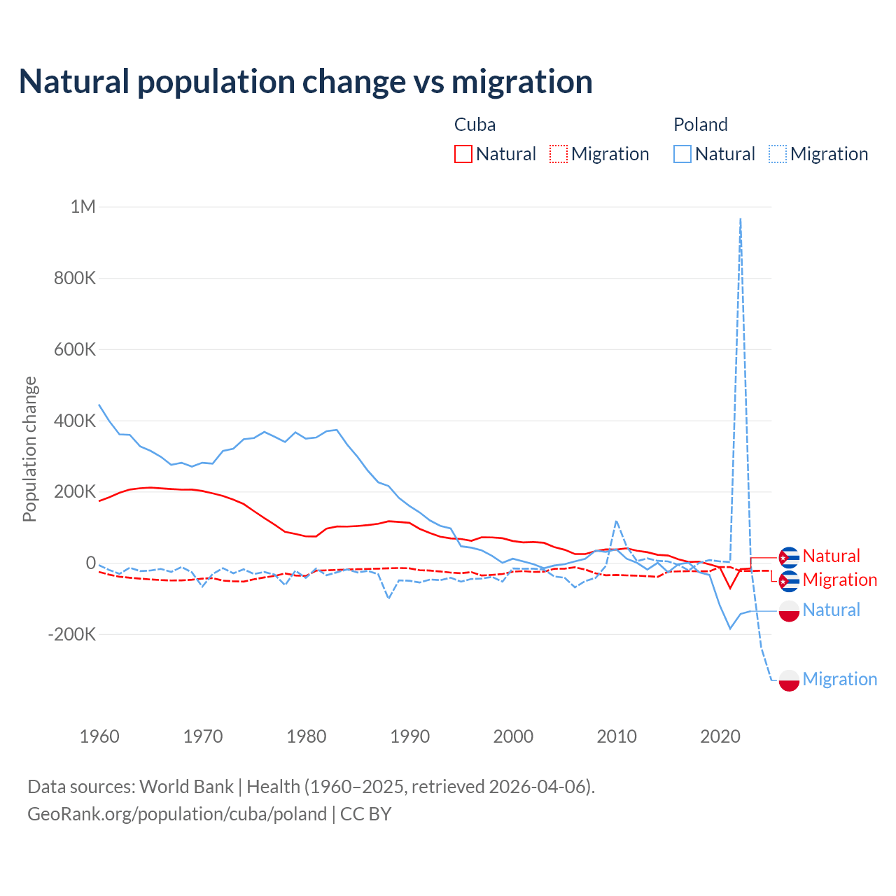 Over the last 10 years, 21.9% of the population change in Cuba is from natural causes (a loss of 64,179 people) and 78.1% is from migration (a loss of 229,508 people). In Poland 41.4% is from natural causes (a loss of 675,443 people) and 58.6% is from migration (a gain of 955,766 people).