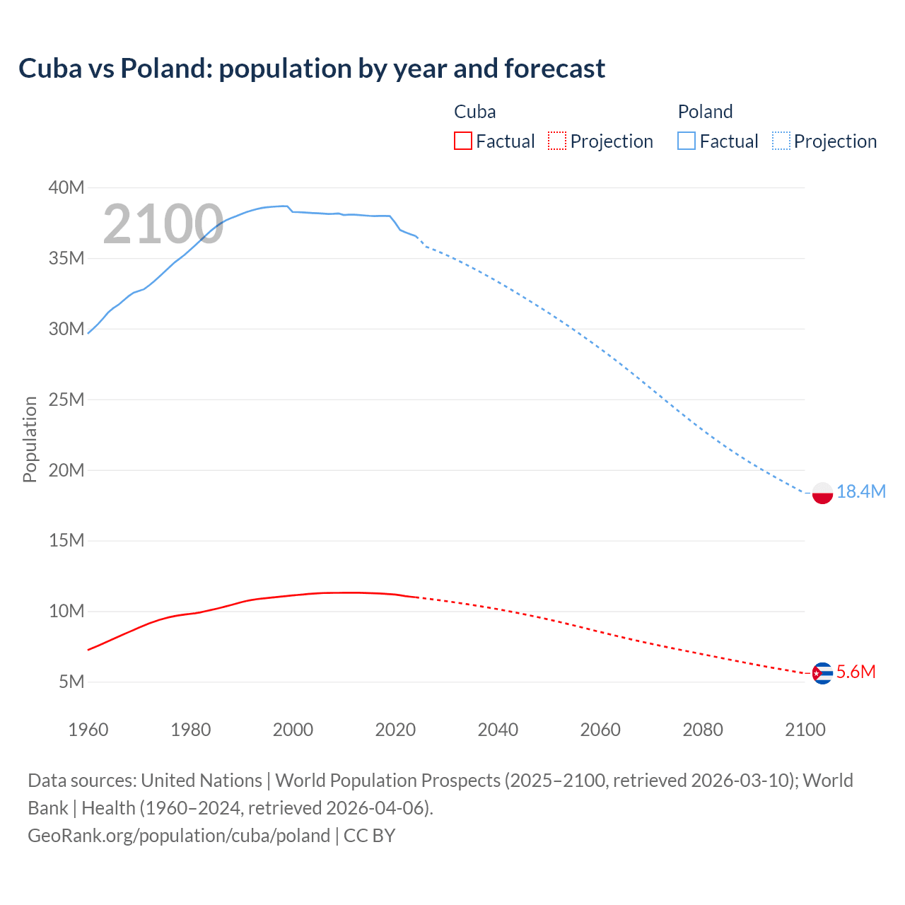The latest officially reported population of Cuba was 10,979,783 in 2024 vs 36,559,233 people in Poland in 2024. In 2026, based on the adjusted UN estimation, the current Cuba's population is 10,894,785 people compared to 35,806,942 in Poland.