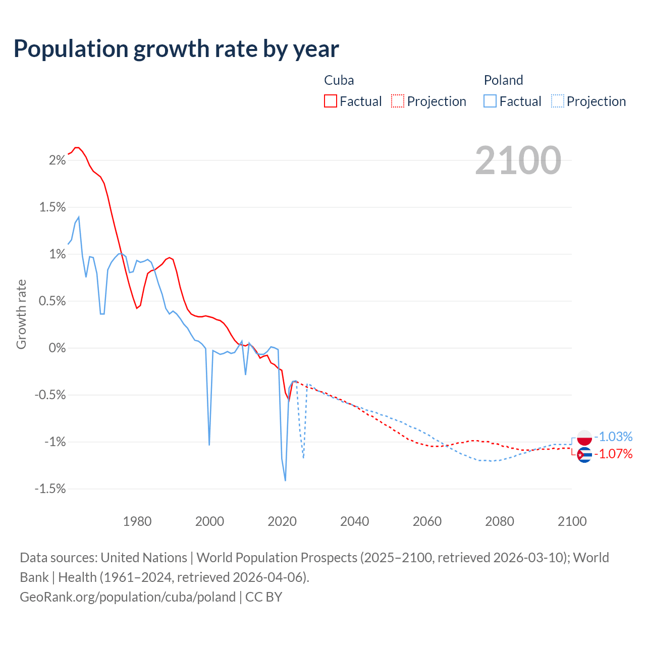 - For the last 10 years, Cuba has had an average growth rate of -0.26% per year vs -0.36% in Poland.