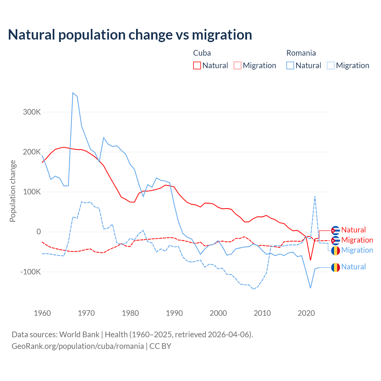 Over the last 10 years, 21.9% of the population change in Cuba is from natural causes (a loss of 64,179 people) and 78.1% is from migration (a loss of 229,508 people). In Romania 82% is from natural causes (a loss of 766,295 people) and 18% is from migration (a loss of 167,917 people).