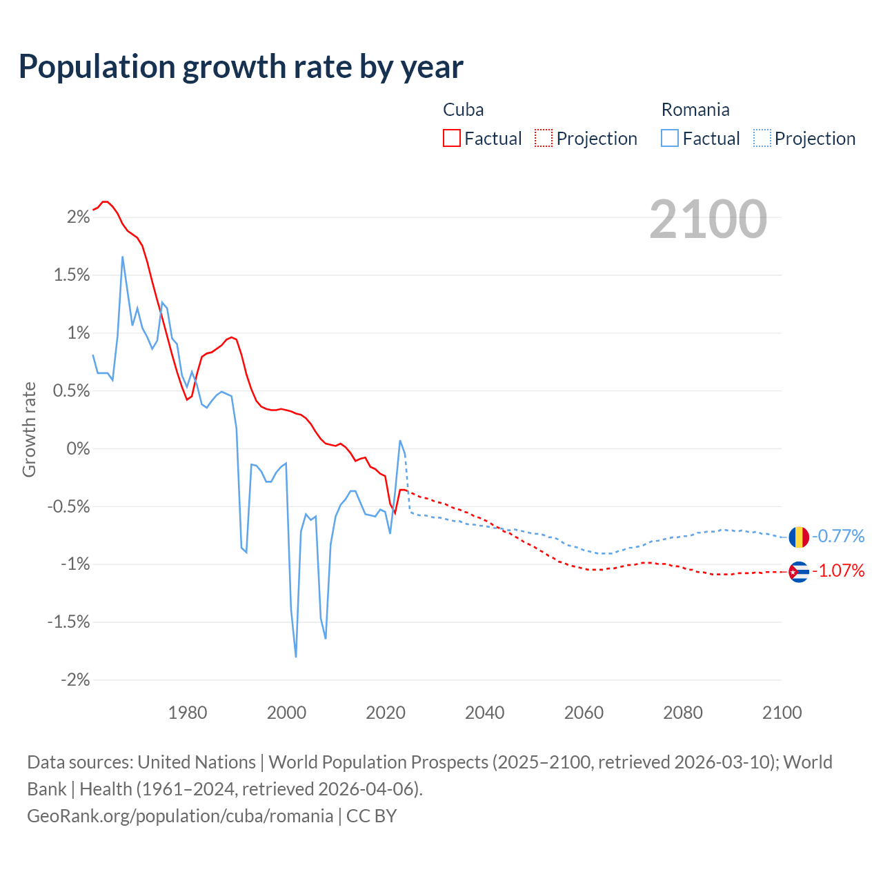 - For the last 10 years, Cuba has had an average growth rate of -0.26% per year vs -0.43% in Romania.