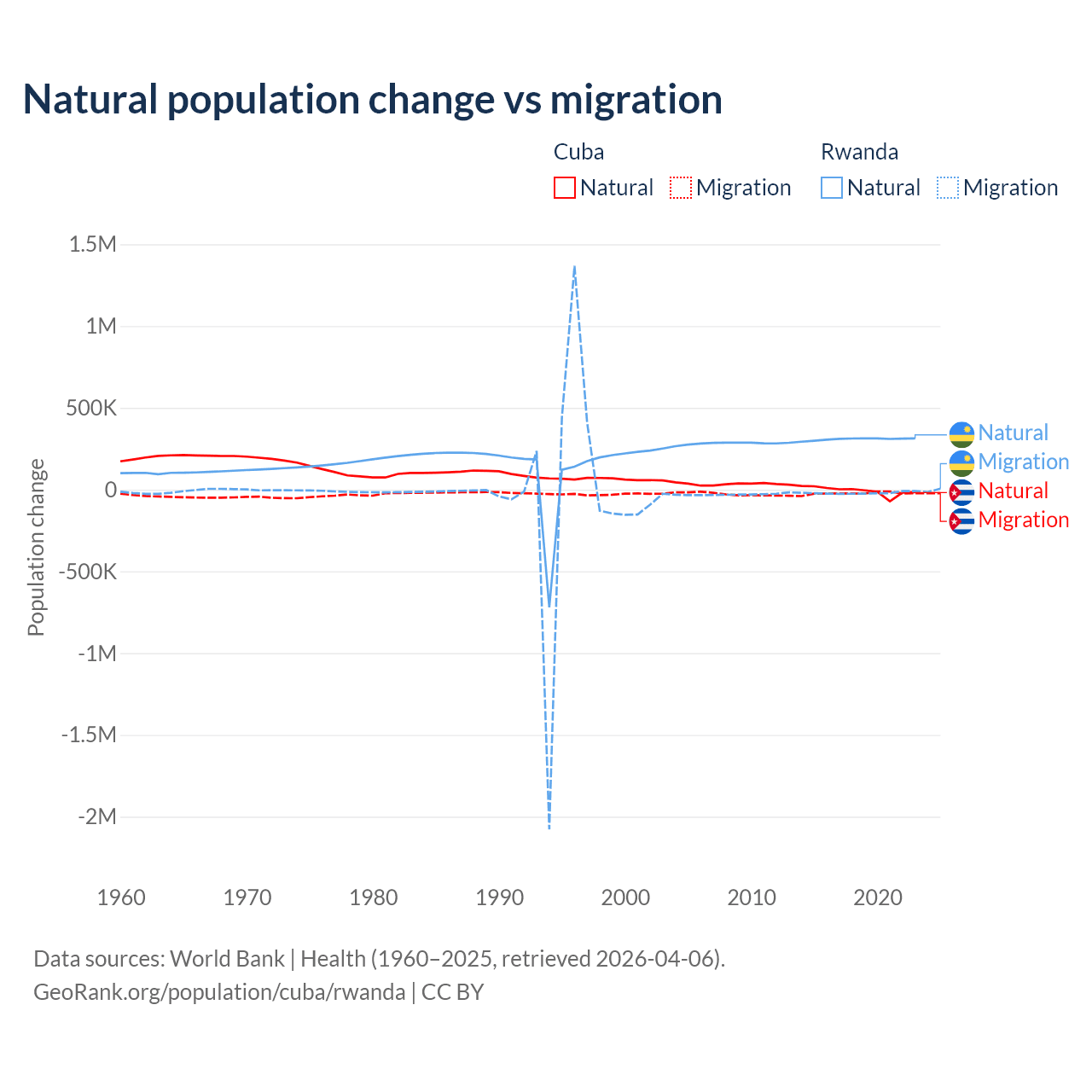 Over the last 10 years, 21.9% of the population change in Cuba is from natural causes (a loss of 64,179 people) and 78.1% is from migration (a loss of 229,508 people). In Rwanda 93.8% is from natural causes (a gain of 3,081,296 people) and 6.18% is from migration (a loss of 203,035 people).