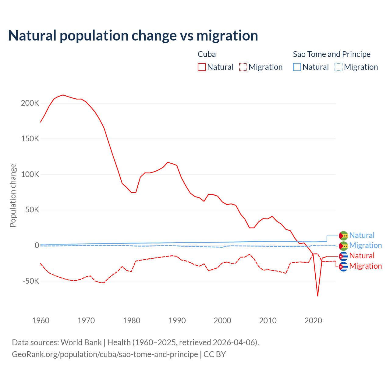 Over the last 10 years, 21.9% of the population change in Cuba is from natural causes (a loss of 64,179 people) and 78.1% is from migration (a loss of 229,508 people). In Sao Tome and Principe 80.1% is from natural causes (a gain of 50,822 people) and 19.9% is from migration (a loss of 12,621 people).