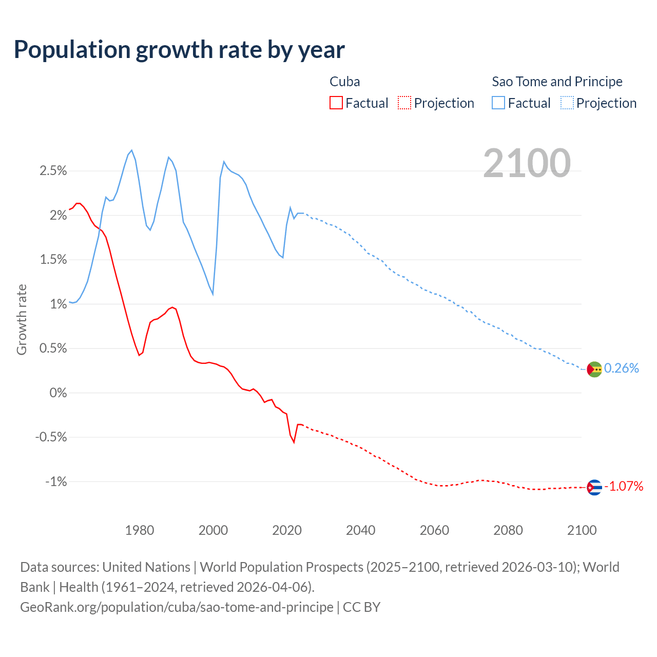 - For the last 10 years, Cuba has had an average growth rate of -0.26% per year vs +1.82% in Sao Tome and Principe.