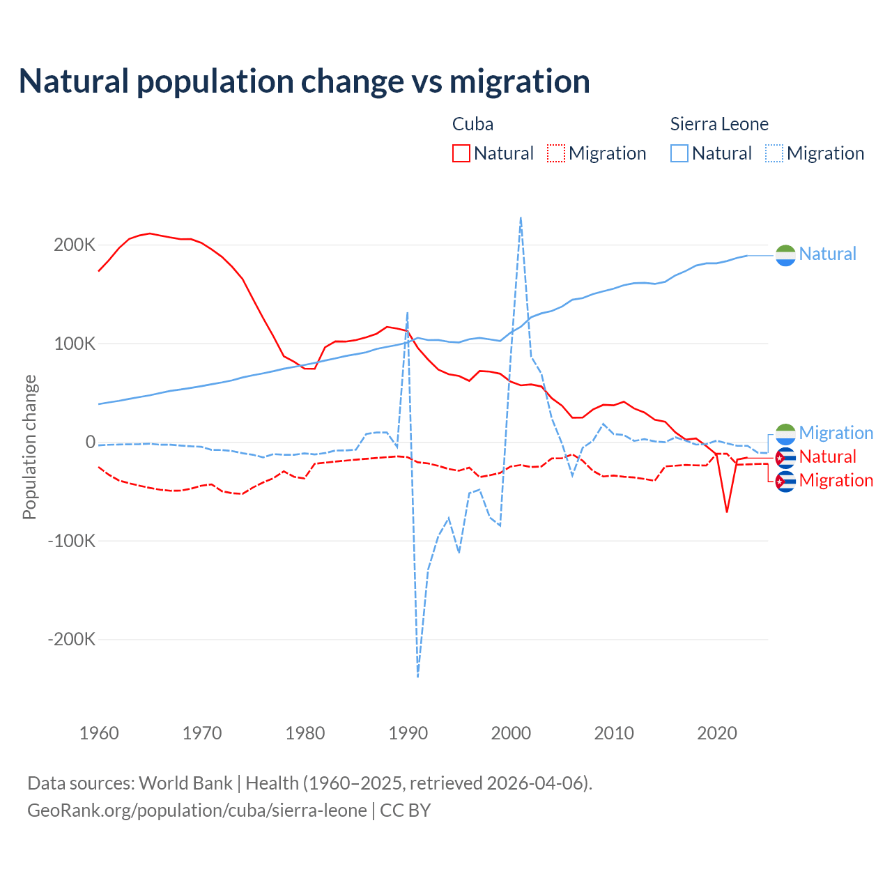 Over the last 10 years, 21.9% of the population change in Cuba is from natural causes (a loss of 64,179 people) and 78.1% is from migration (a loss of 229,508 people). In Sierra Leone 99.6% is from natural causes (a gain of 1,764,049 people) and 0.41% is from migration (a loss of 7,211 people).