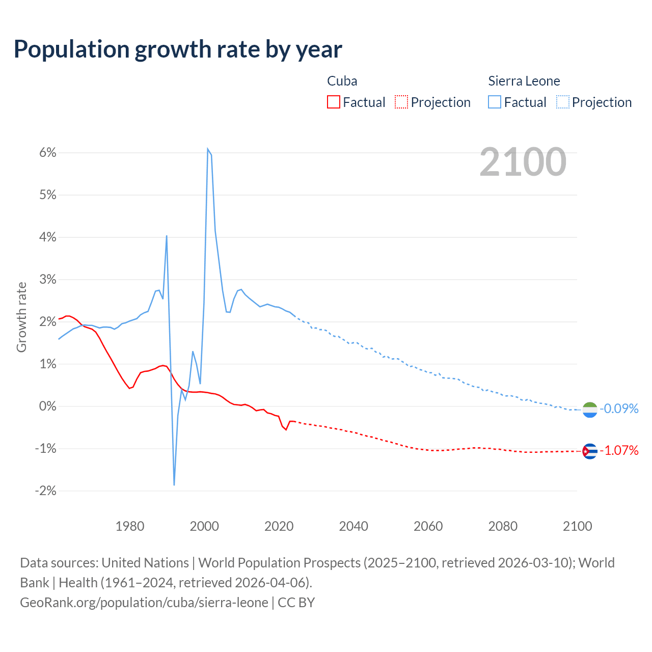- For the last 10 years, Cuba has had an average growth rate of -0.26% per year vs +2.32% in Sierra Leone.