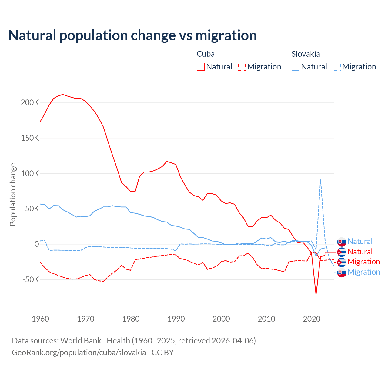 Over the last 10 years, 21.9% of the population change in Cuba is from natural causes (a loss of 64,179 people) and 78.1% is from migration (a loss of 229,508 people). In Slovakia 7.47% is from natural causes (a loss of 8,728 people) and 92.5% is from migration (a gain of 108,156 people).