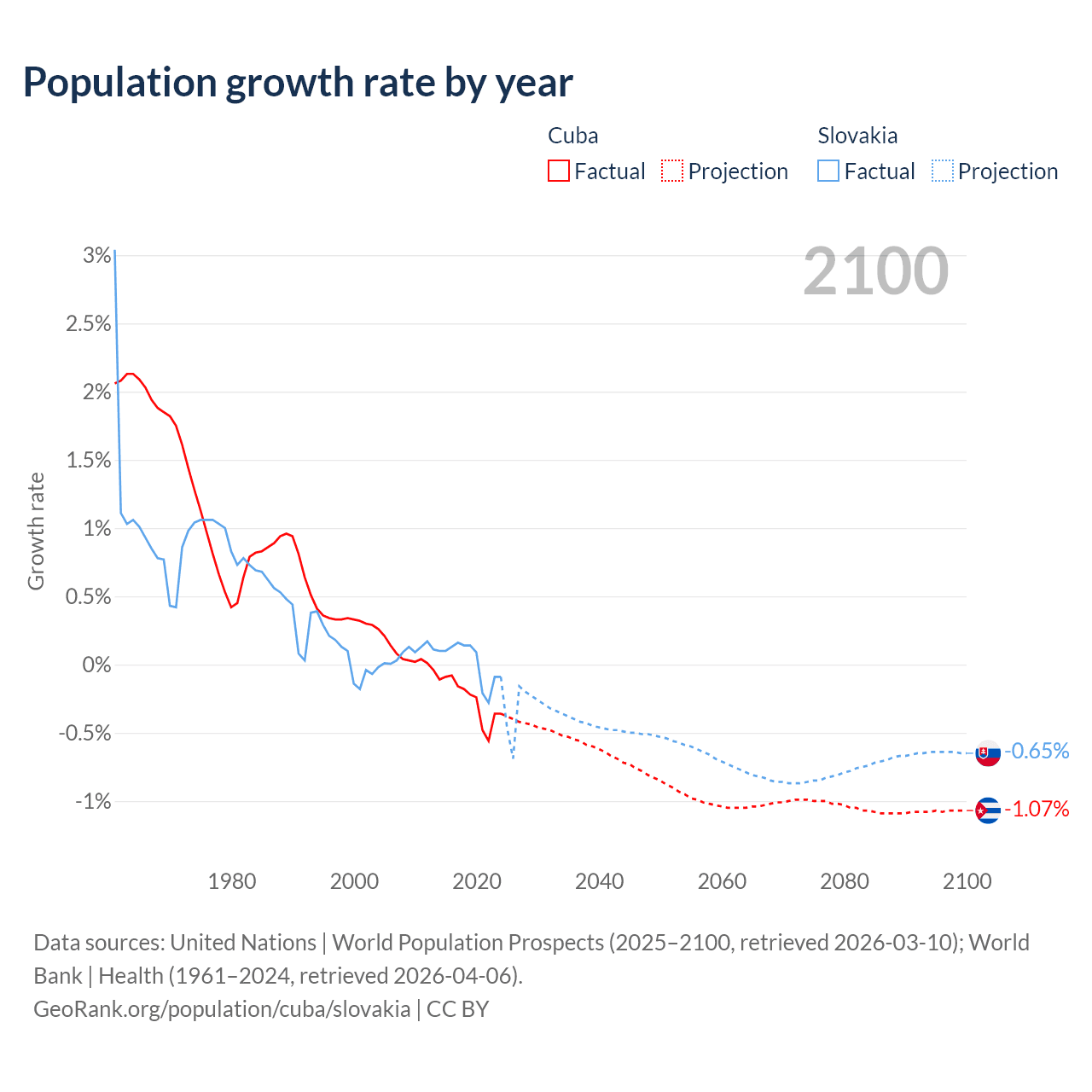 - For the last 10 years, Cuba has had an average growth rate of -0.26% per year vs +0.01% in Slovakia.