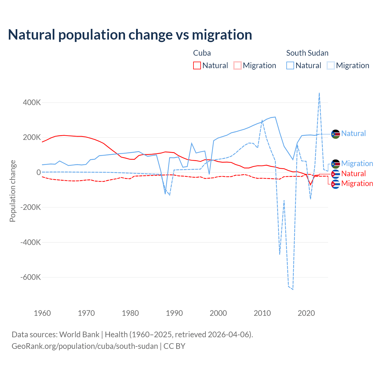 Over the last 10 years, 21.9% of the population change in Cuba is from natural causes (a loss of 64,179 people) and 78.1% is from migration (a loss of 229,508 people). In South Sudan 57.4% is from natural causes (a gain of 1,792,135 people) and 42.6% is from migration (a loss of 1,329,606 people).