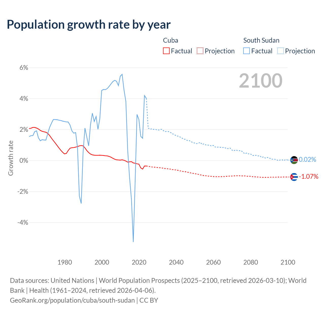 - For the last 10 years, Cuba has had an average growth rate of -0.26% per year vs +0.65% in South Sudan.