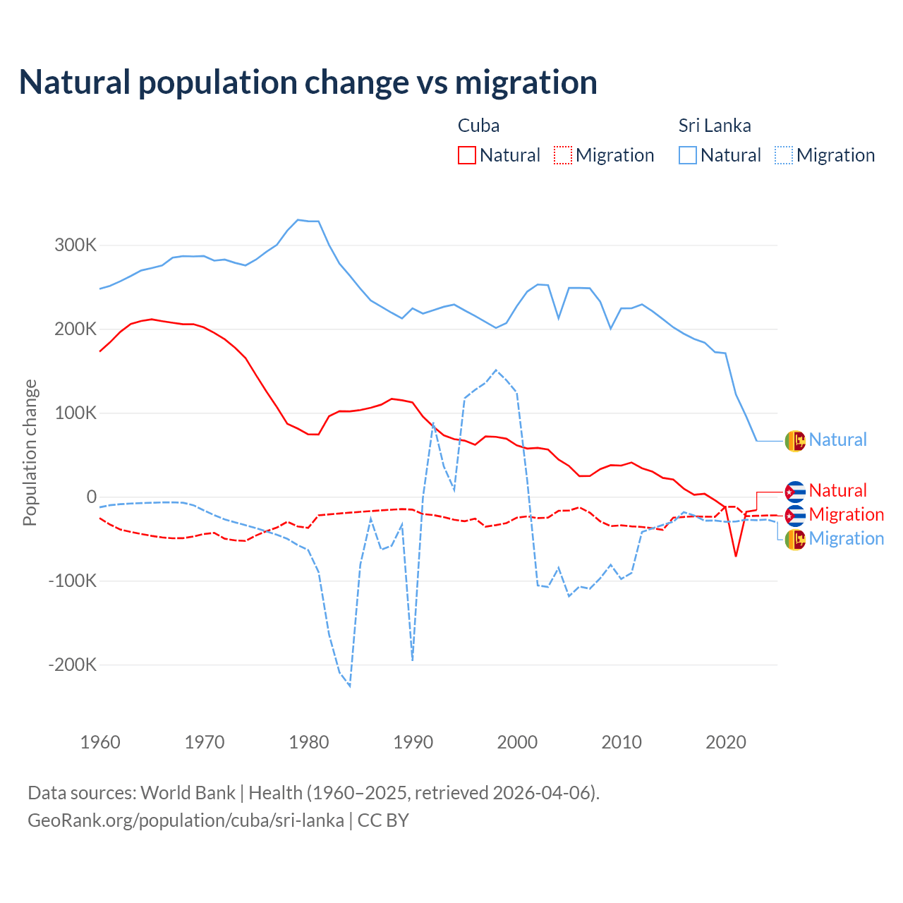 Over the last 10 years, 21.9% of the population change in Cuba is from natural causes (a loss of 64,179 people) and 78.1% is from migration (a loss of 229,508 people). In Sri Lanka 85.3% is from natural causes (a gain of 1,605,749 people) and 14.7% is from migration (a loss of 276,121 people).