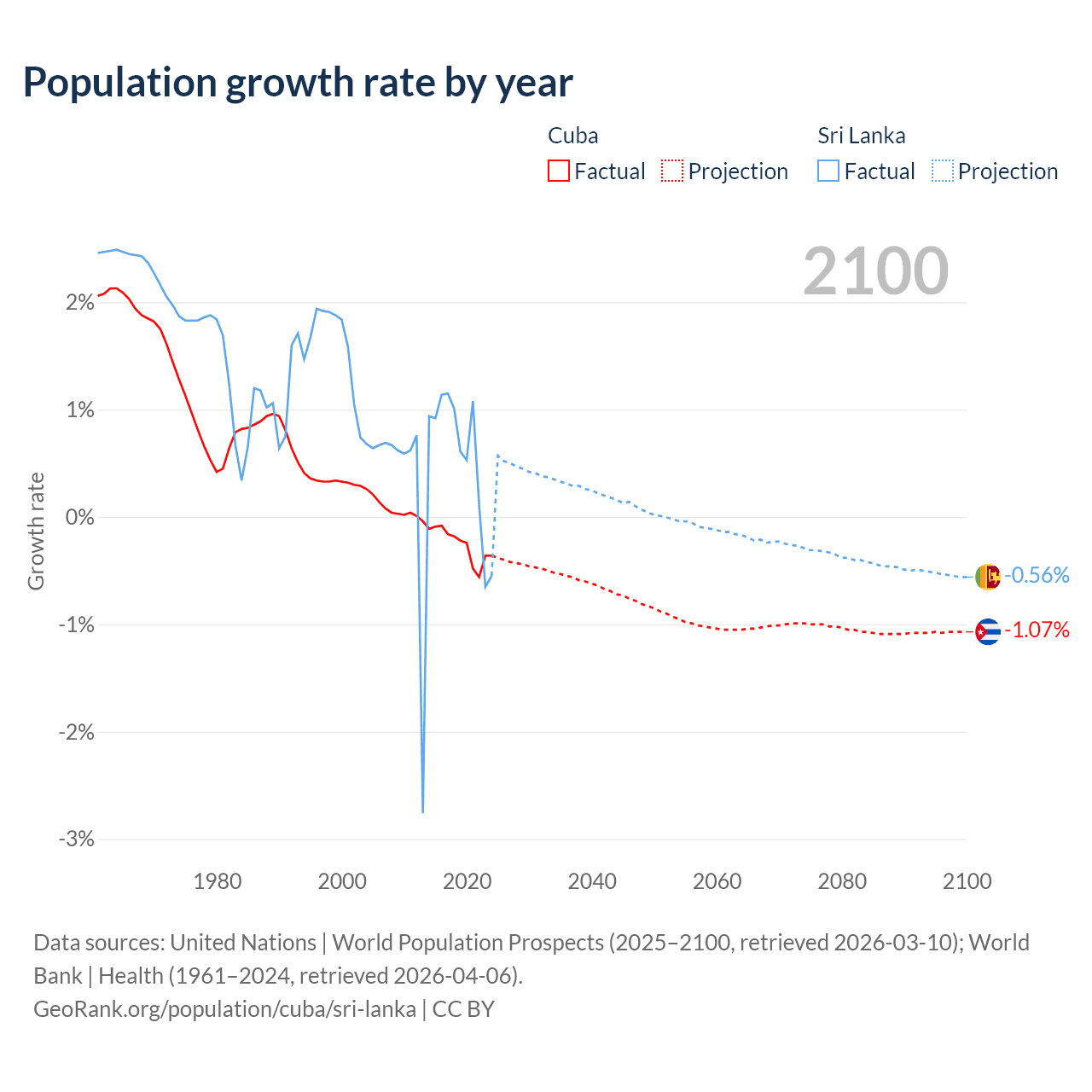 - For the last 10 years, Cuba has had an average growth rate of -0.26% per year vs +0.57% in Sri Lanka.