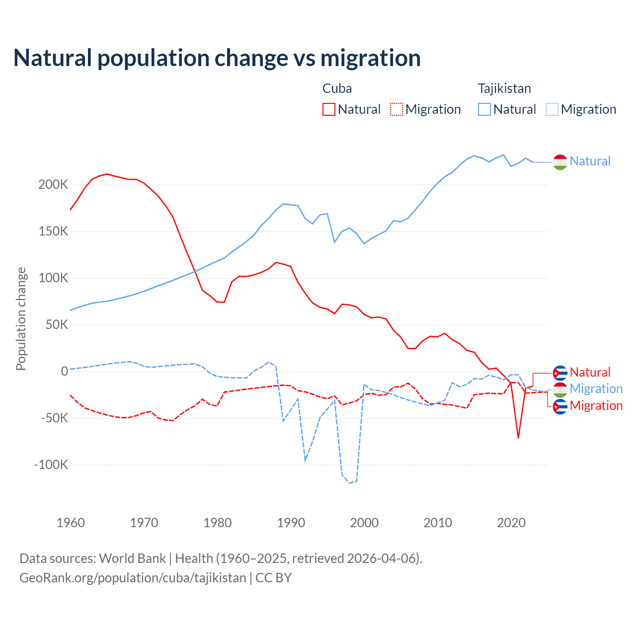 Over the last 10 years, 21.9% of the population change in Cuba is from natural causes (a loss of 64,179 people) and 78.1% is from migration (a loss of 229,508 people). In Tajikistan 96% is from natural causes (a gain of 2,266,045 people) and 3.95% is from migration (a loss of 93,205 people).