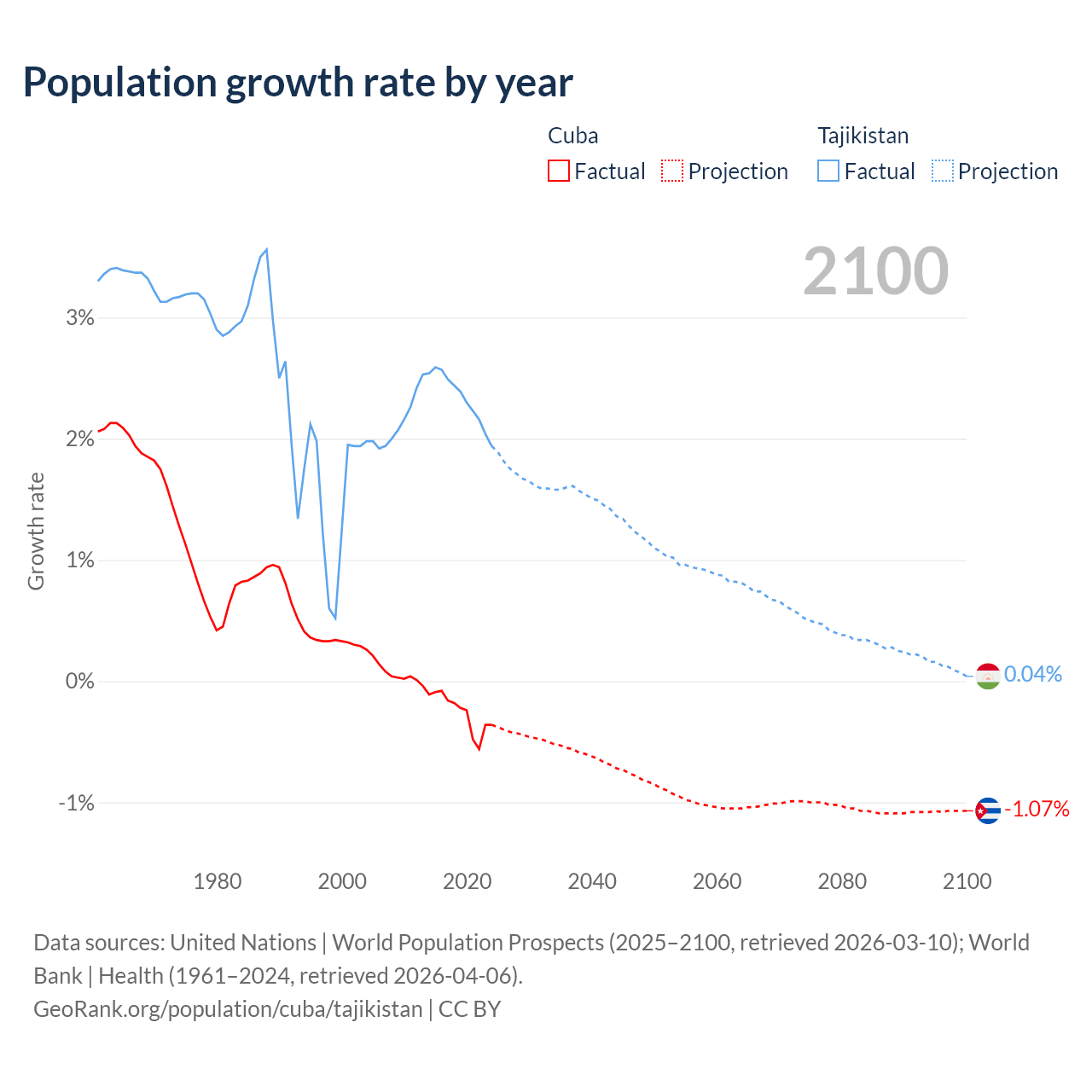 Data sources: World Bank | Health (1960–2024, retrieved 2026-04-06); United Nations | World Population Prospects (1960–2026, retrieved 2026-03-10); U.S. Census Bureau (1960–2025, retrieved 2026-02-08); Central Intelligence Agency (CIA) (2000–2019, retrieved 2026-02-20).