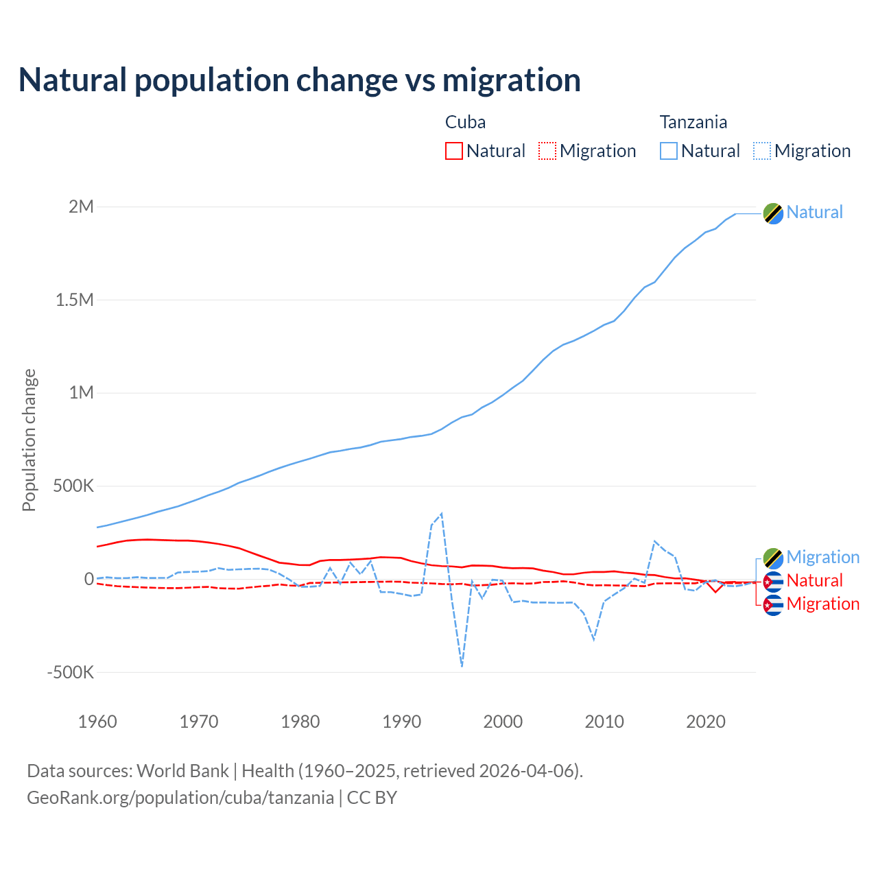 Over the last 10 years, 21.9% of the population change in Cuba is from natural causes (a loss of 64,179 people) and 78.1% is from migration (a loss of 229,508 people). In Tanzania 98.7% is from natural causes (a gain of 17,769,541 people) and 1.27% is from migration (a gain of 229,466 people).
