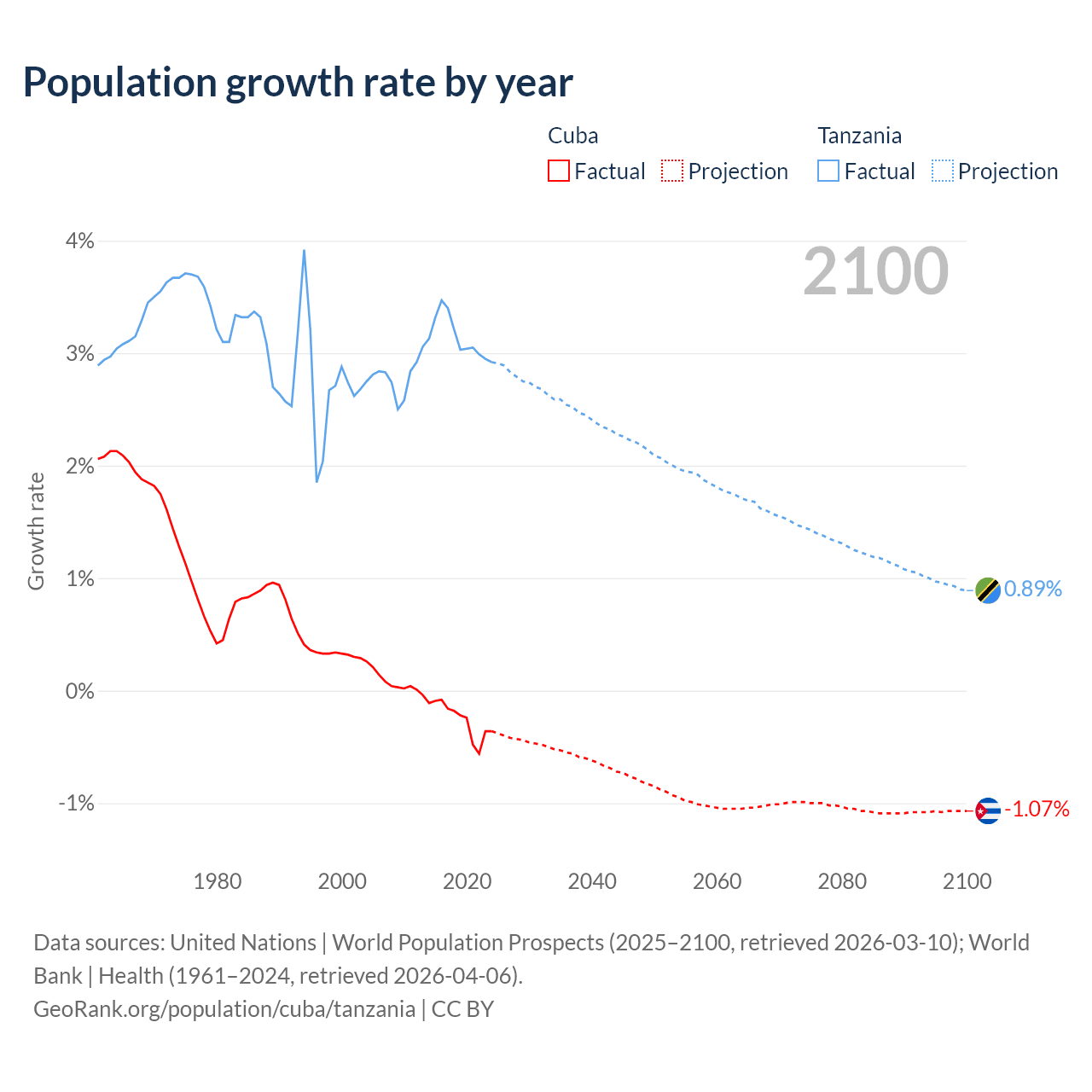 - For the last 10 years, Cuba has had an average growth rate of -0.26% per year vs +3.13% in Tanzania.
