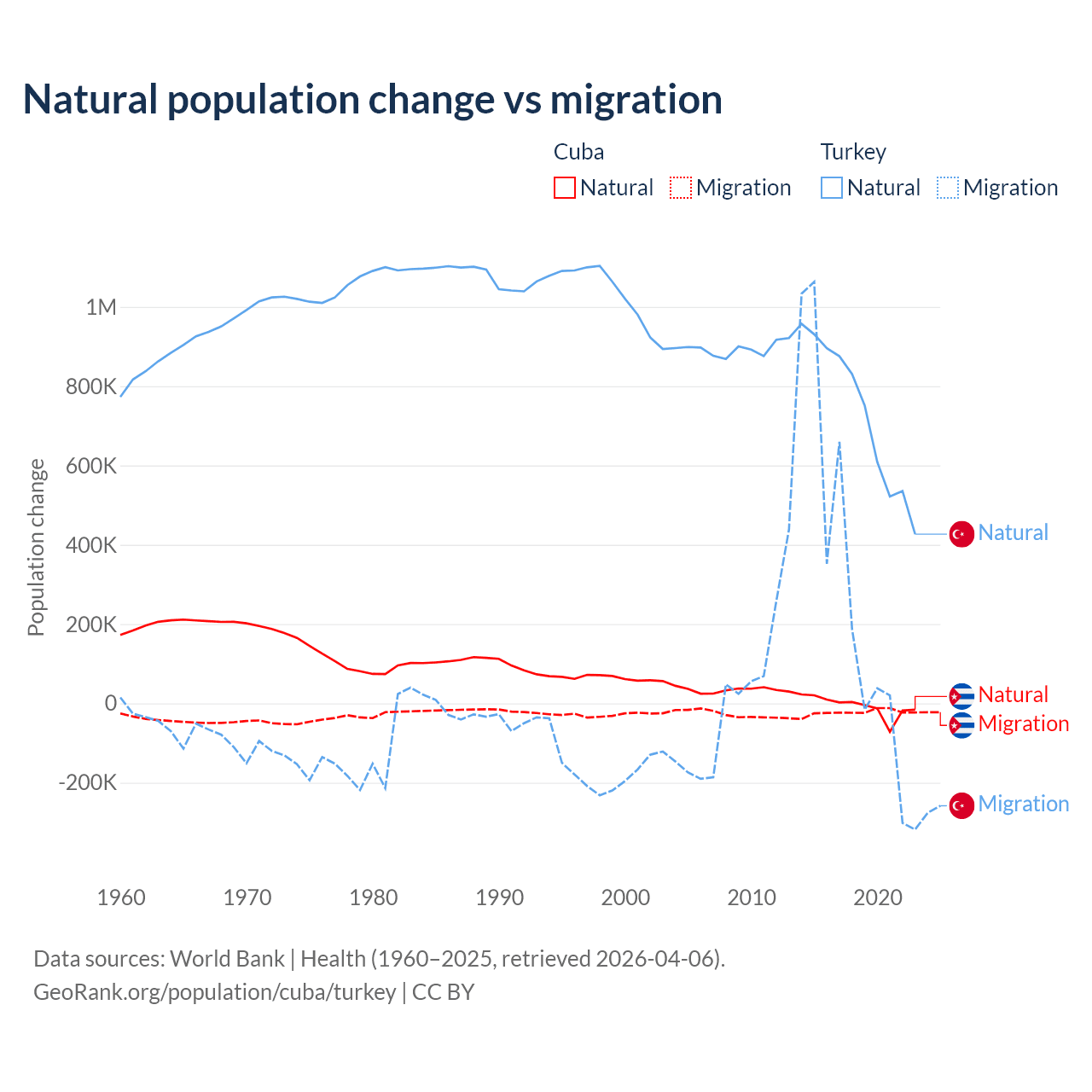Over the last 10 years, 21.9% of the population change in Cuba is from natural causes (a loss of 64,179 people) and 78.1% is from migration (a loss of 229,508 people). In Turkey 73% is from natural causes (a gain of 7,333,352 people) and 27% is from migration (a gain of 2,718,916 people).