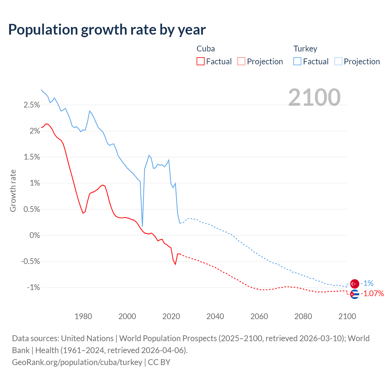 - For the last 10 years, Cuba has had an average growth rate of -0.26% per year vs +1.06% in Turkey.