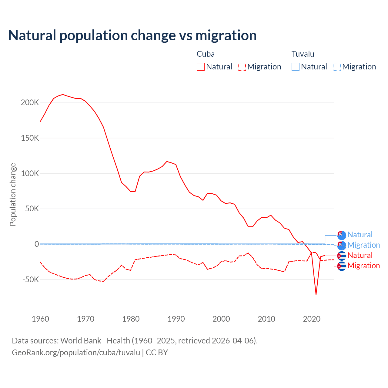 Over the last 10 years, 21.9% of the population change in Cuba is from natural causes (a loss of 64,179 people) and 78.1% is from migration (a loss of 229,508 people). In Tuvalu 35.5% is from natural causes (a gain of 1,556 people) and 64.5% is from migration (a loss of 2,827 people).