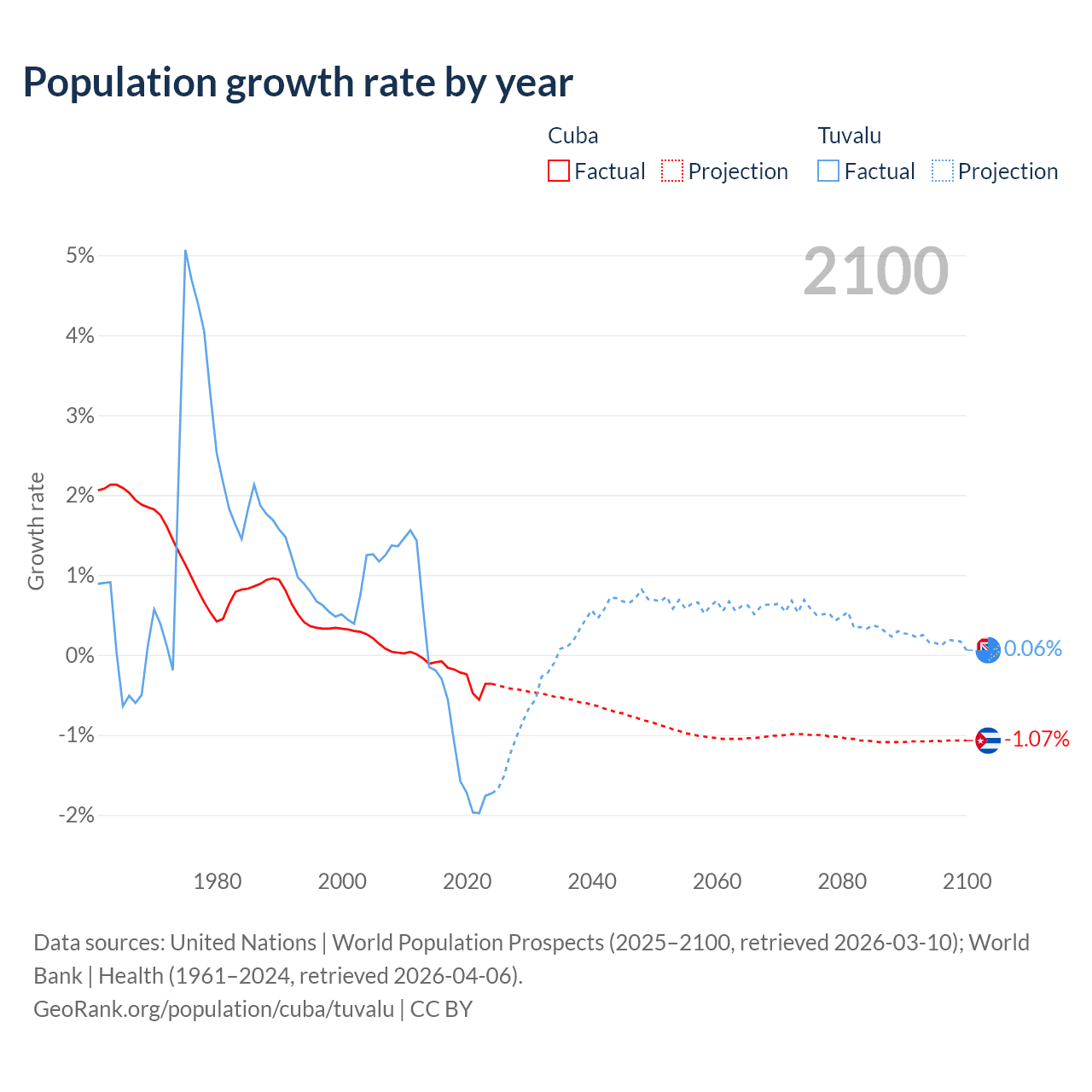 - For the last 10 years, Cuba has had an average growth rate of -0.26% per year vs -1.19% in Tuvalu.