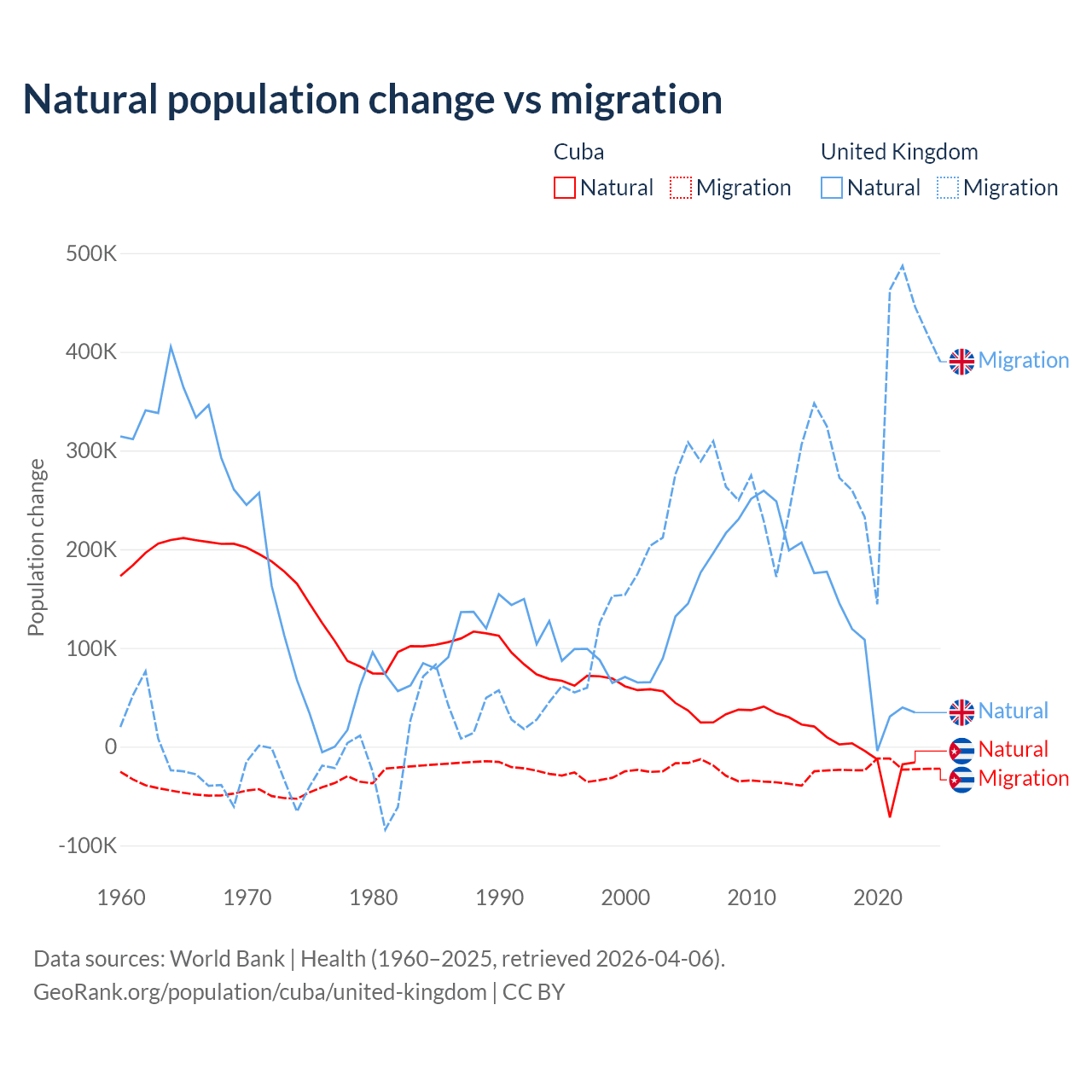 Over the last 10 years, 21.9% of the population change in Cuba is from natural causes (a loss of 64,179 people) and 78.1% is from migration (a loss of 229,508 people). In the United Kingdom 23.9% is from natural causes (a gain of 1,033,129 people) and 76.1% is from migration (a gain of 3,283,101 people).