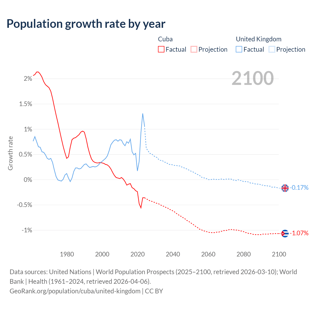 - For the last 10 years, Cuba has had an average growth rate of -0.26% per year vs +0.7% in the United Kingdom.