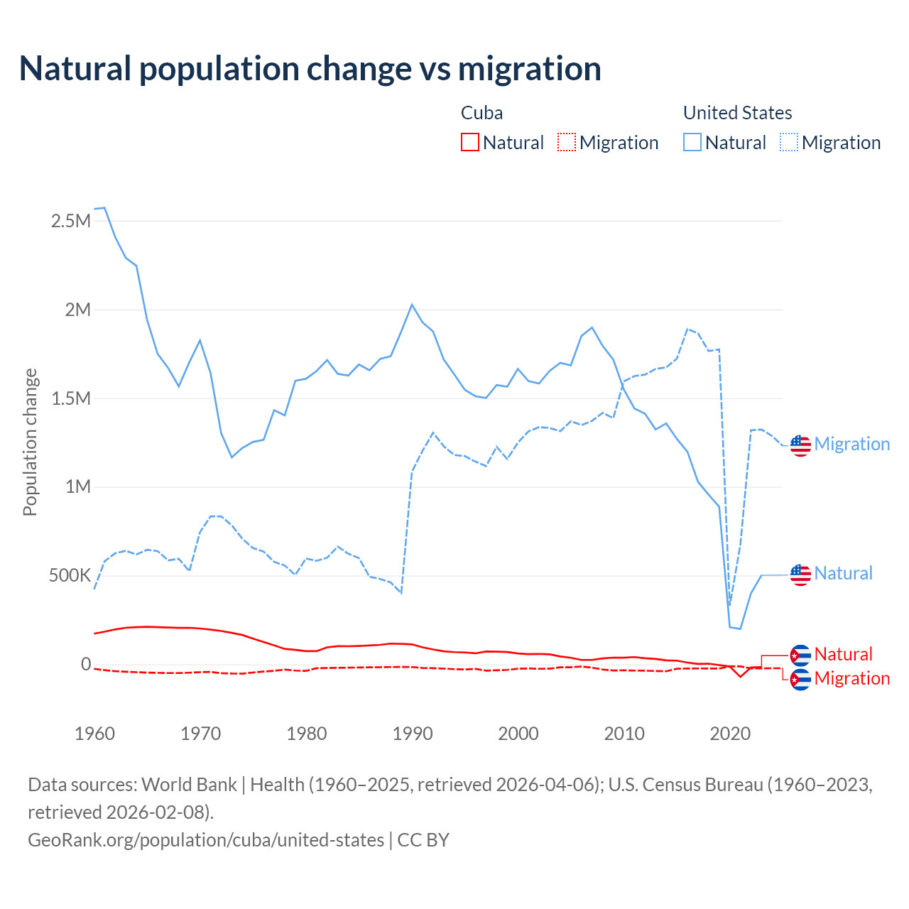 Over the last 10 years, 21.9% of the population change in Cuba is from natural causes (a loss of 64,179 people) and 78.1% is from migration (a loss of 229,508 people). In the United States 35.8% is from natural causes (a gain of 8,005,866 people) and 64.2% is from migration (a gain of 14,334,286 people).