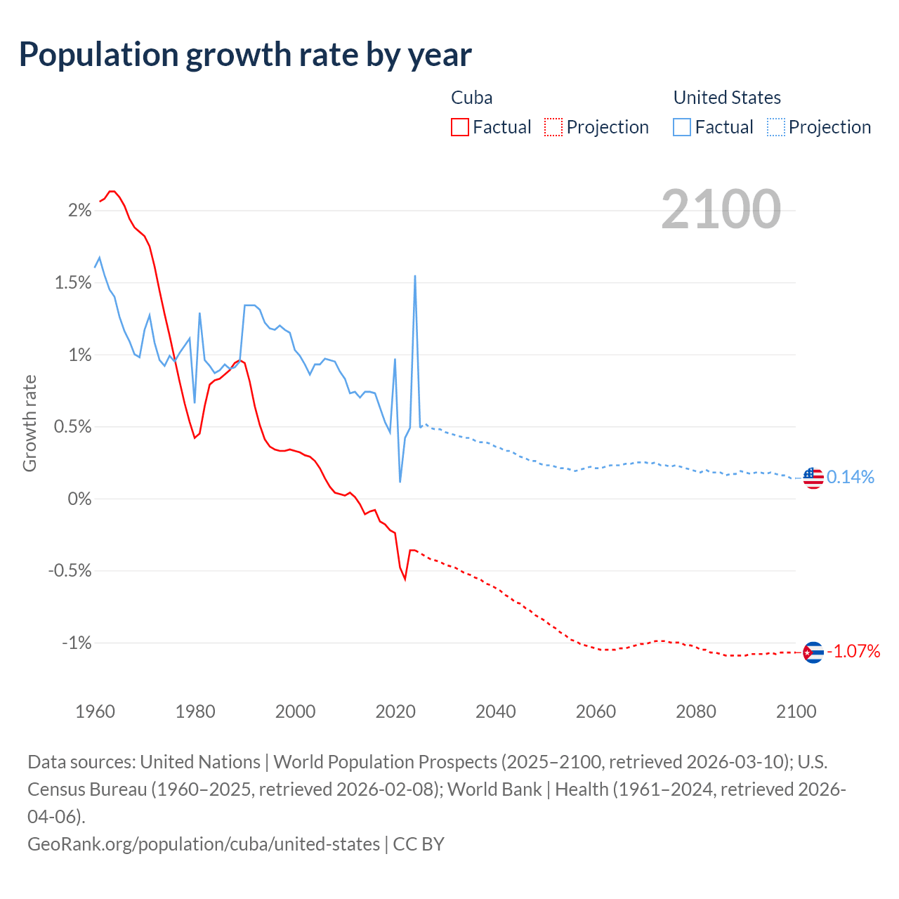 - For the last 10 years, Cuba has had an average growth rate of -0.26% per year vs +0.65% in the United States.