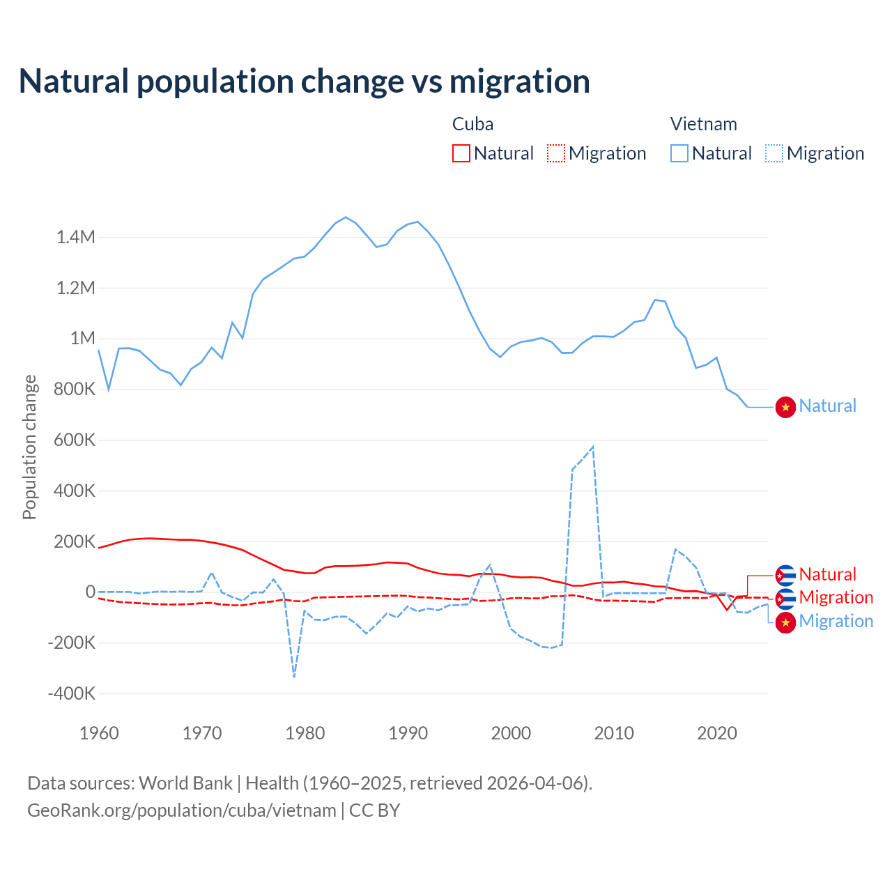 Over the last 10 years, 21.9% of the population change in Cuba is from natural causes (a loss of 64,179 people) and 78.1% is from migration (a loss of 229,508 people). In Vietnam 97.7% is from natural causes (a gain of 9,349,756 people) and 2.29% is from migration (a gain of 219,073 people).