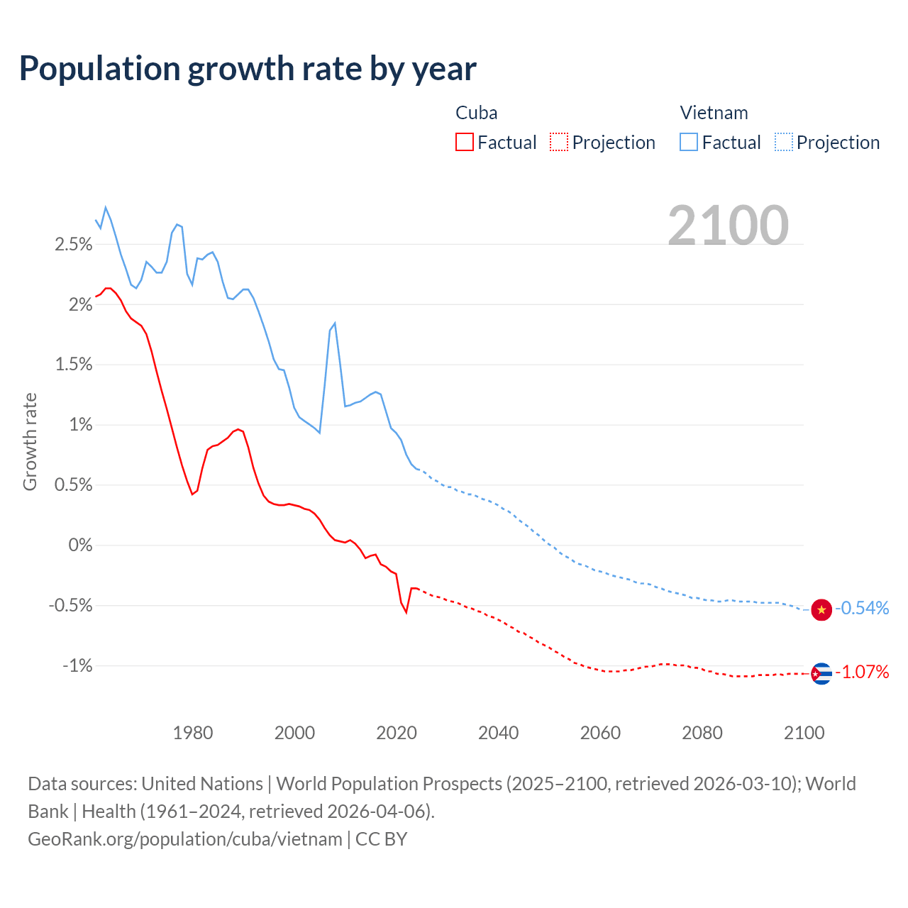 - For the last 10 years, Cuba has had an average growth rate of -0.26% per year vs +0.99% in Vietnam.