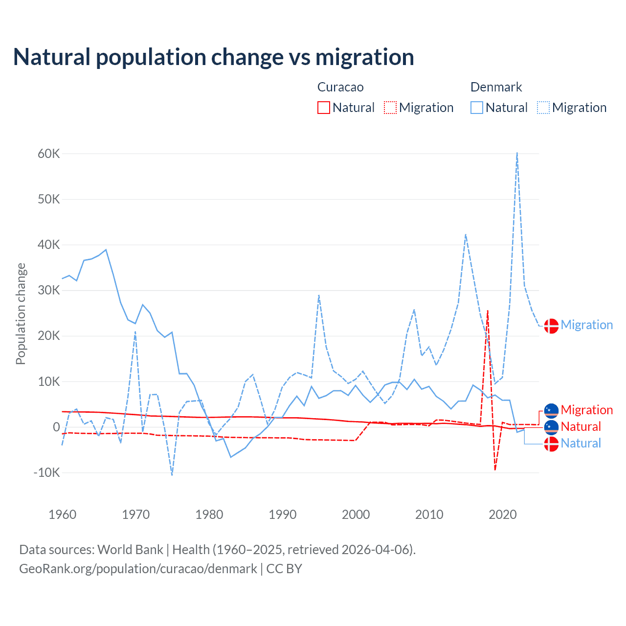 Over the last 10 years, 3.72% of the population change in Curacao is from natural causes (a gain of 834 people) and 96.3% is from migration (a gain of 21,615 people). In Denmark 15.4% is from natural causes (a gain of 51,826 people) and 84.6% is from migration (a gain of 284,848 people).