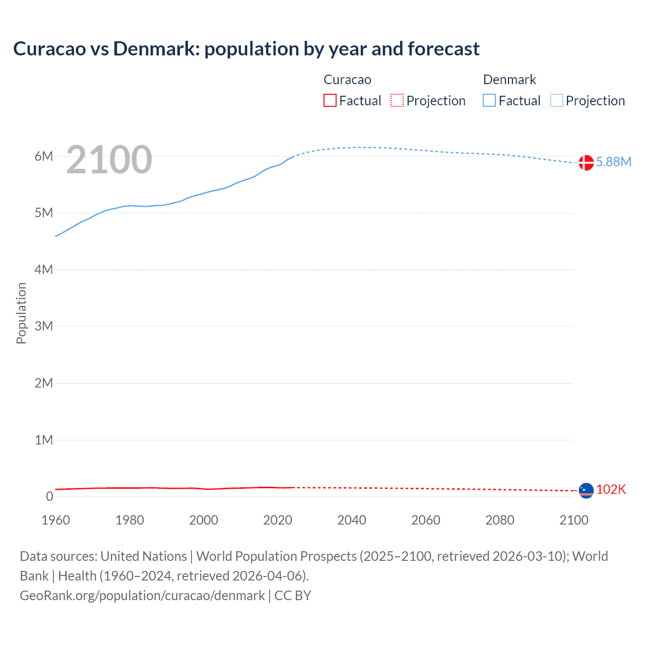 The latest officially reported population of Curacao was 155,967 in 2024 vs 5,976,992 people in Denmark in 2024. In 2026, based on the adjusted UN estimation, the current Curacao's population is 155,976 people compared to 6,032,403 in Denmark.
