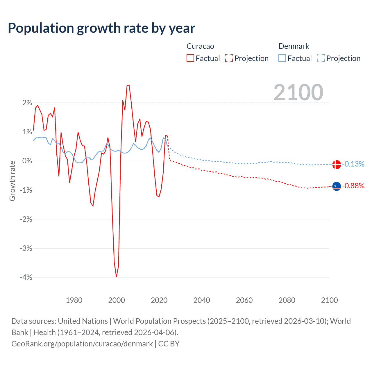 - For the last 10 years, Curacao has had an average growth rate of +0.13% per year vs +0.57% in Denmark.