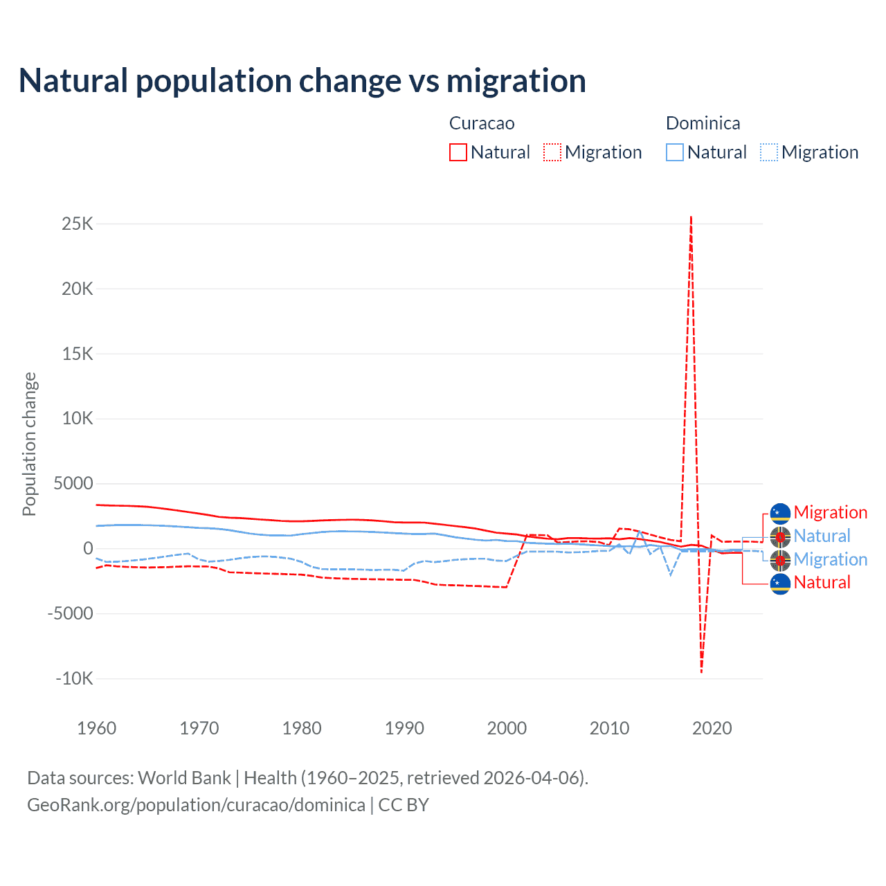 Over the last 10 years, 3.72% of the population change in Curacao is from natural causes (a gain of 834 people) and 96.3% is from migration (a gain of 21,615 people). In Dominica 4.63% is from natural causes (a loss of 190 people) and 95.4% is from migration (a loss of 3,914 people).